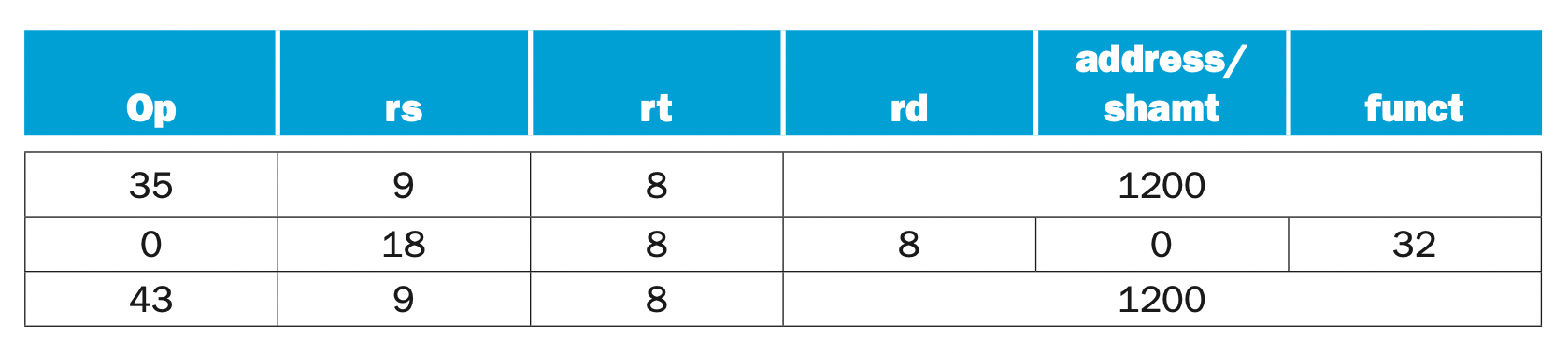 // C언어로 A[12] = h + A[8] // MIPS 어셈블리 언어 명령어로 lw $t0, 32($s3) add $t0, $s2, $t0 sw $t0, 48($s3) - 상수 피연산자 / 수치(immediate) 피연산자