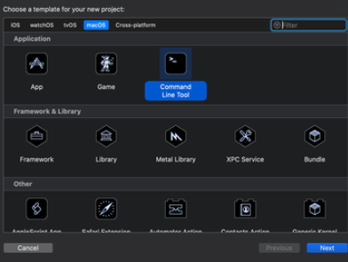 그래서 꼭 새 프로젝트를 만들어서 아래와 같이 macOS를 누르고 Command Line Tool로 만든 다음, Language를 선택해야 한다.