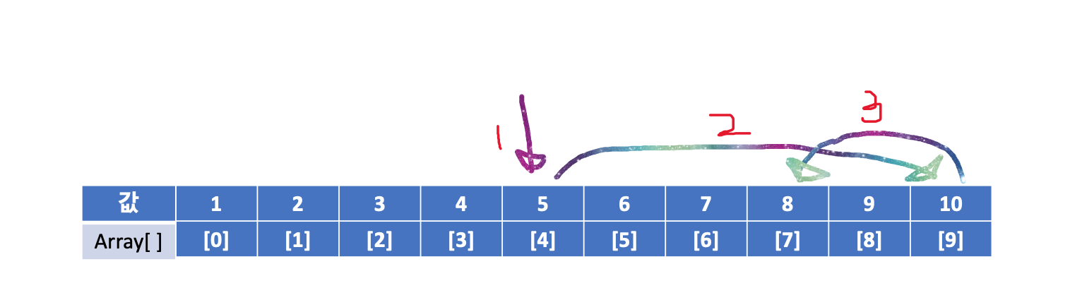 array에 들어있는 값을 처음 원소부터 찾지 않고, 중간값, 또 그 중간값, 또 그 중간값... 하면서 찾는거다