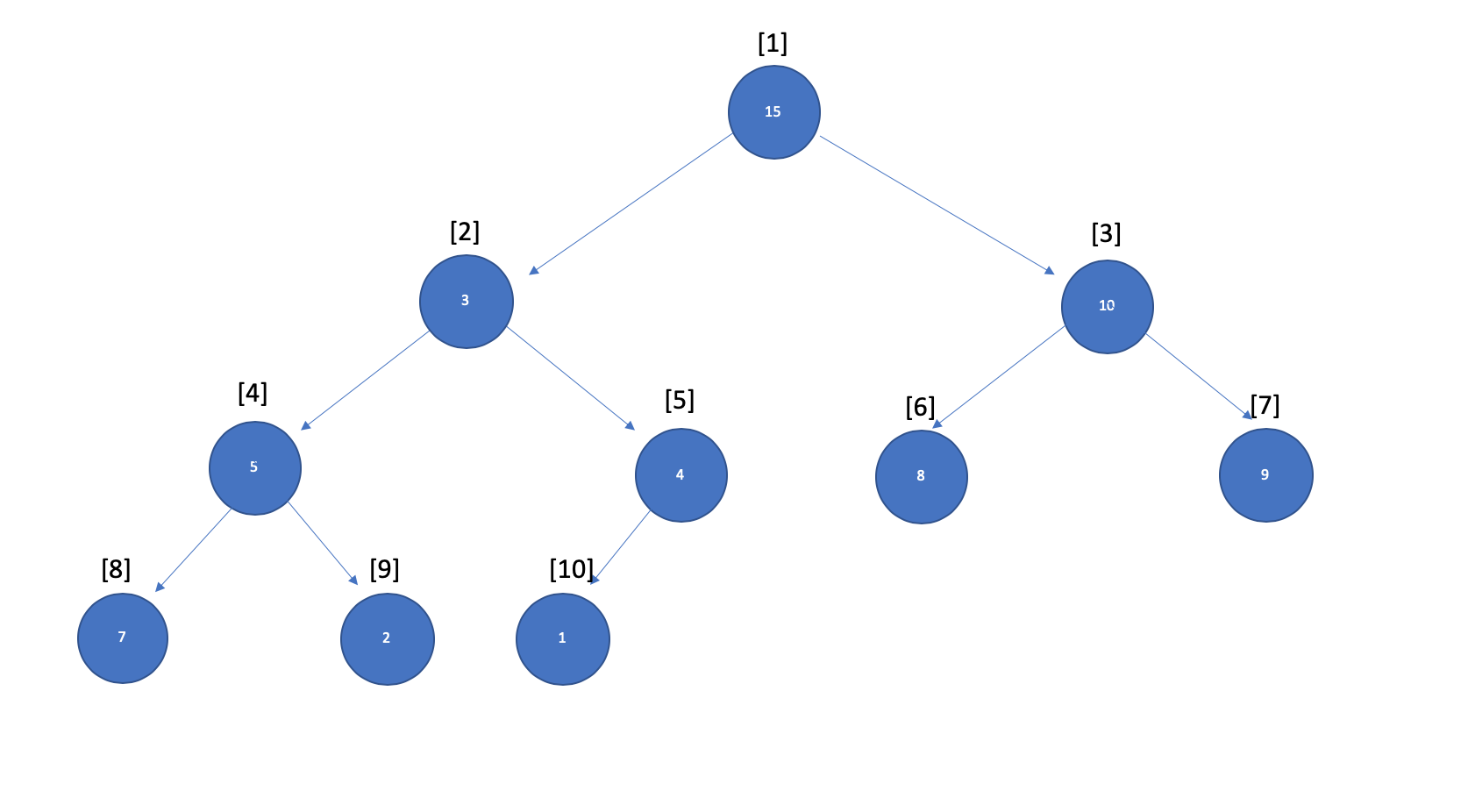 (최대 힙인 경우) 시작점은 배열 갯수의 절반에 해당하는 노드이다. 예를 들어 배열에 10개의 요소가 있다면, 5번 노드부터 시작한다.
