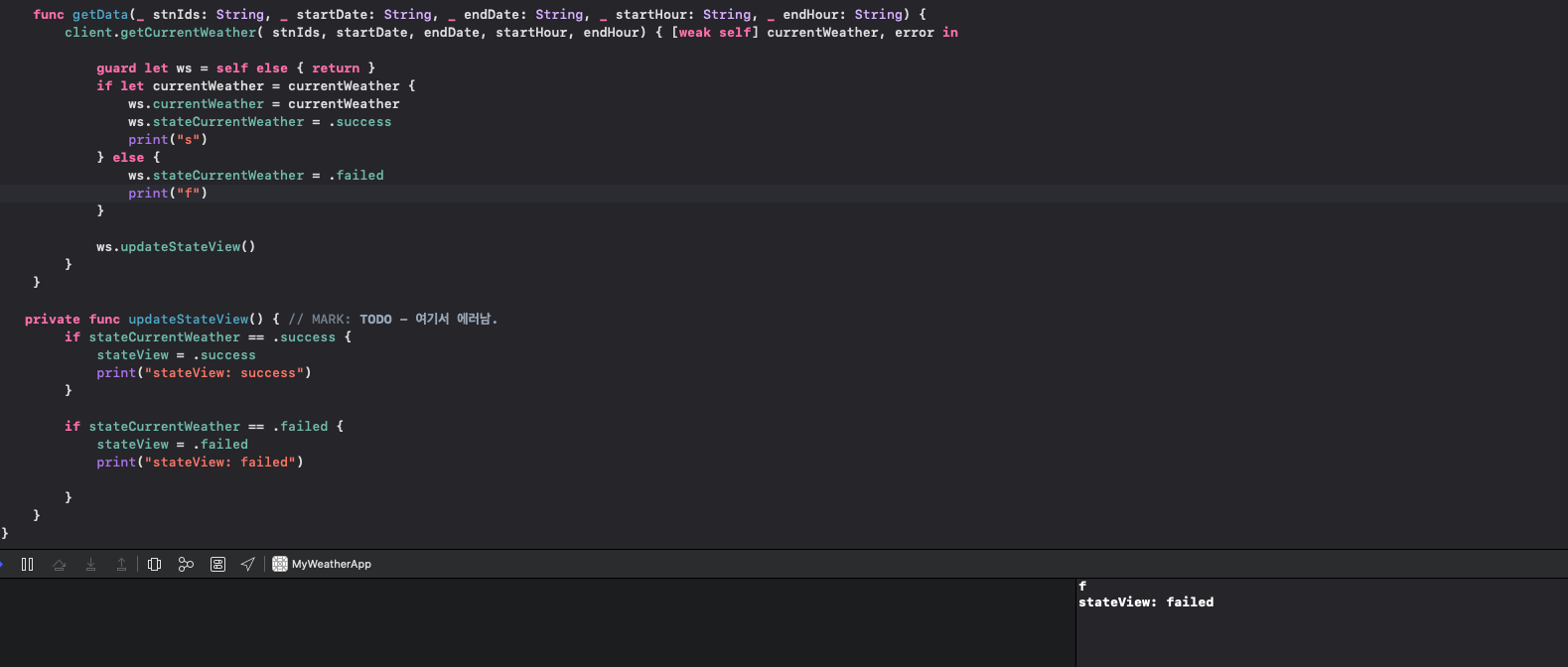 그렇다면 왜 stateCurrentWeather가 failed가 된걸까 찾는다.