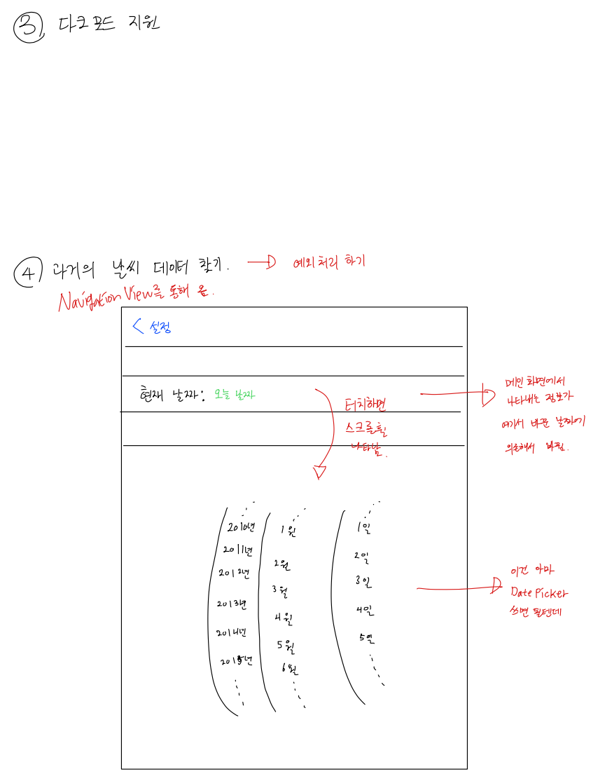 지금까지 되긴 되지만 고쳐야 하는것 -> picker의 view레이아웃 문제, location 표시. location이 안뜨기 때문에 내가 정한 위치의 날씨를 받는것인지 모른다. ... 왜... 안되는거지?