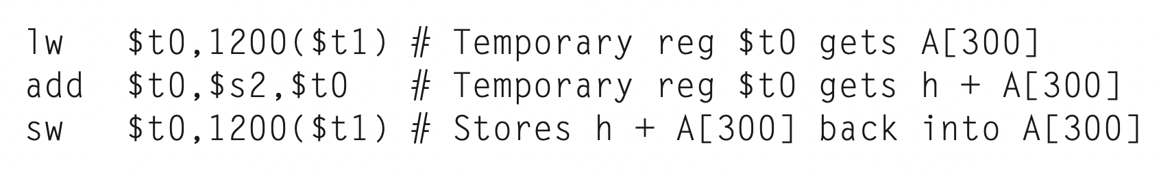 // C언어로 A[12] = h + A[8] // MIPS 어셈블리 언어 명령어로 lw $t0, 32($s3) add $t0, $s2, $t0 sw $t0, 48($s3) - 상수 피연산자 / 수치(immediate) 피연산자