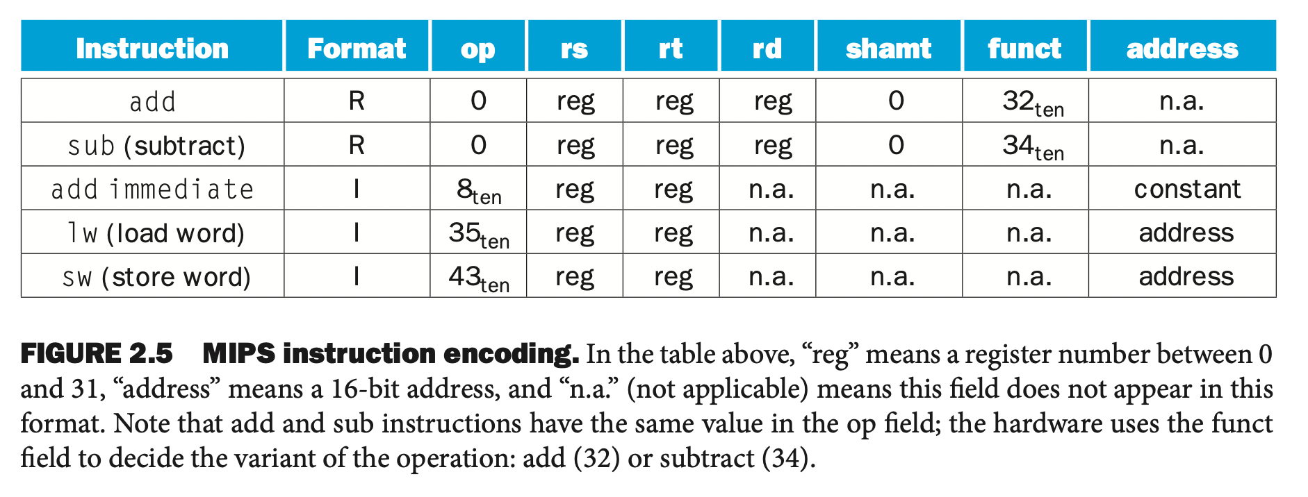 op : 명령어가 실행할 연산의 종류로서 연산자(opcode) 라고 부른다op (6 bits) rs (5 bits) rt (5 bits) rd (5 bits) shamt (5 bits) funct (6 bits)