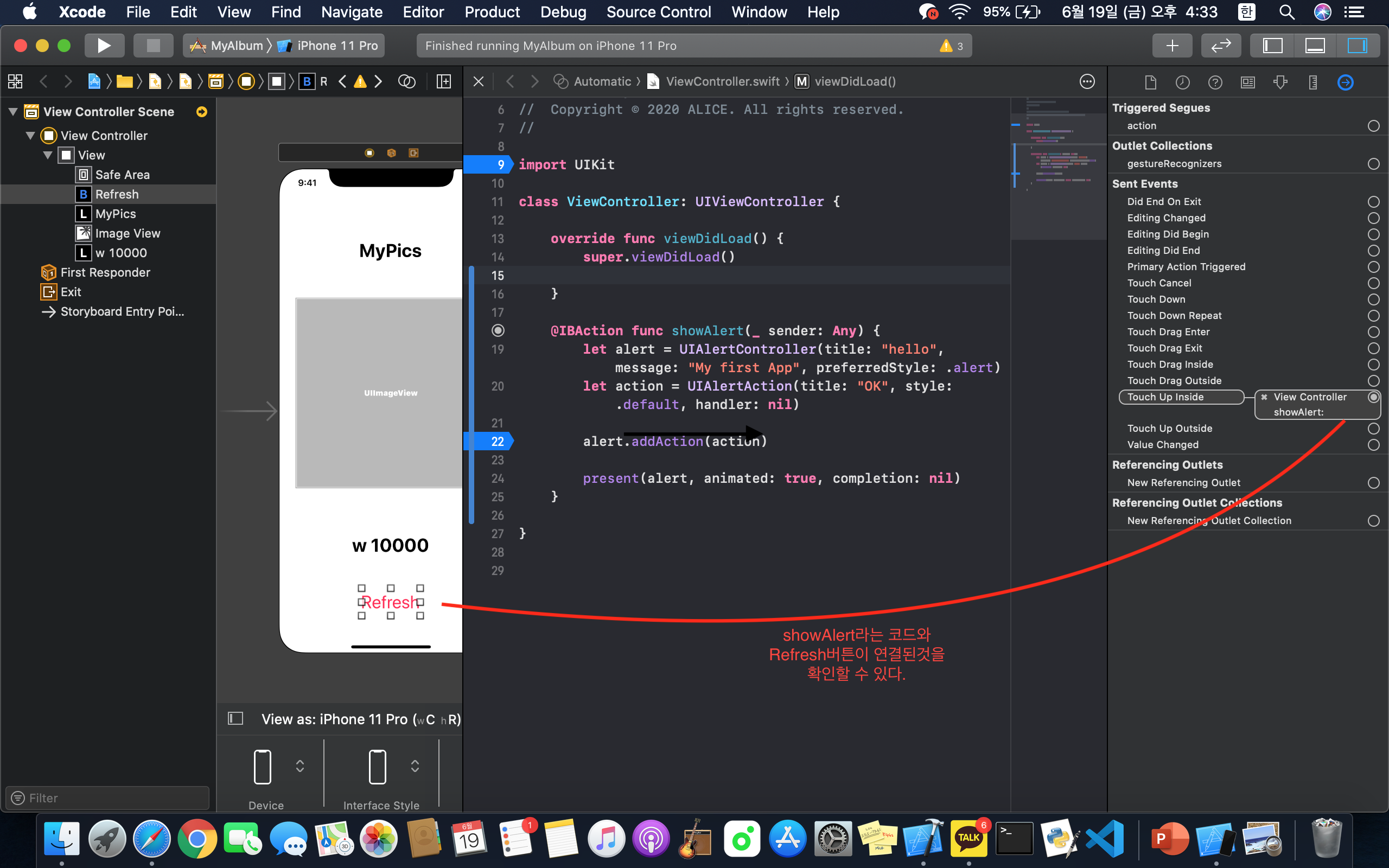 스토리보드에 글자, 사진, 버튼을 넣고, 버튼을 누르면 알람창이 뜨도록 동작시키는것을 했다.
